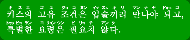 1ページから9ページまで全部読んだけど,頭の中にはな〜んにも残ってないという方,いらっしゃいますか? そういうあなたのために特別なページを作りました! とにかくこのページさえしっかり押さえれば,基本的な母音10個・子音14個は絶対に覚えられます! でもちょっと努力が必要なので,覚悟して下さい!! といっても,ある呪文を繰り返し書いて練習するだけです.そのうえ呪文は1つだけ.では,さっそく呪文の発表です! ![]() この呪文の日本語訳は“キスの固有(の)条件はくちびるどうし合わせればよく,特別な要領は必要でない.”です.意味がわかったところで「だから何よ?」って感じだと思いますが,実はこの呪文には基本母音の10個と濃音を除いた子音14個がすべて含まれているんです.だから,この呪文さえ覚えれば,基本的な24個の部品を覚えられるというわけです! いきなり文章を覚えろ!っていうのもあんまりですが,どうしても覚えられない方のための秘密兵器(?)として紹介しました.この呪文は読んで暗記するんじゃなくて,何度も書いて覚えてください.そのとき,下の赤い色の部品がどの母音で,青い色の部品がどの子音なのか,一番下の表でひとつひとつ確認しながら書いてください.時間がかかるとは思いますが,単に書くだけでなく,何の部品なのかをちゃんと意識しながら書くことで,頭に残りやすくなるはずです. ![]() ![]() これでも覚えられない方がいらしたらどうしよう…? いや,たぶん大丈夫なはずです! 頑張りましょう!! |