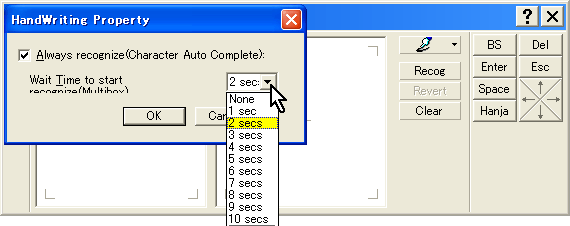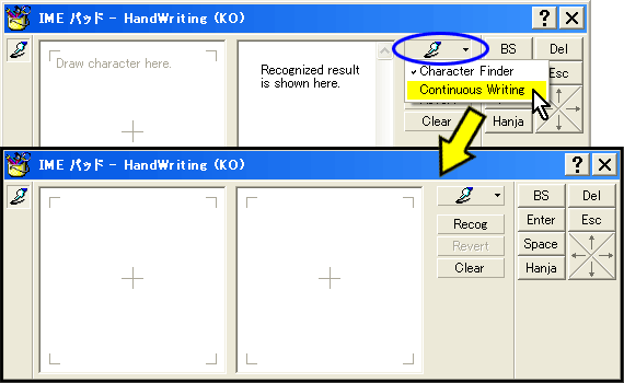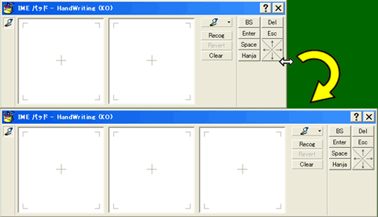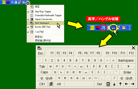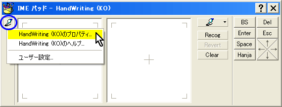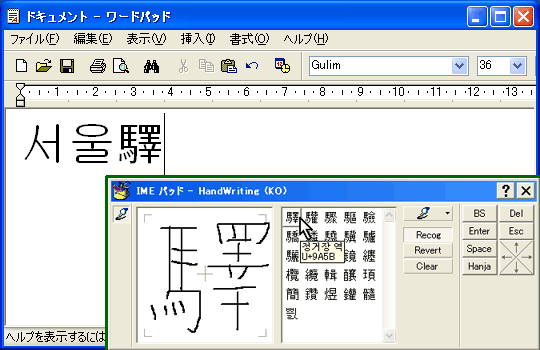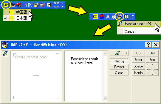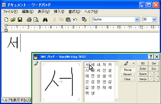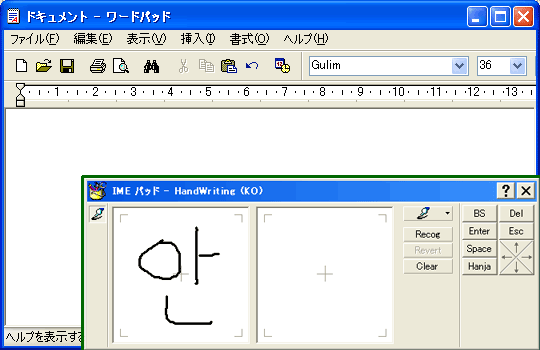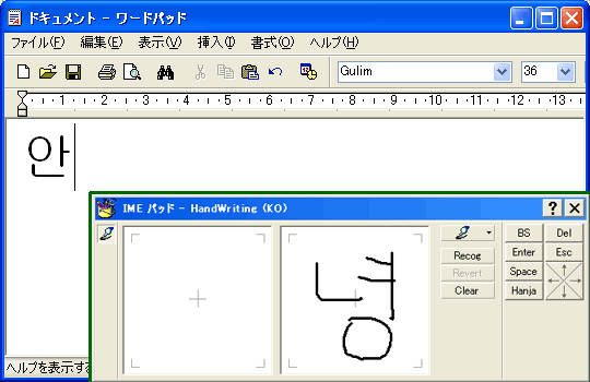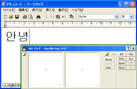 ■韓国語IME操作法(手書き入力・ソフトキーボード) このページは,Windows XPの韓国語IMEで手書き入力やソフトキーボードを使用する方法をまとめています. キーボードでハングル入力するのは難しそう,または,一時的に数文字入力するだけ,という方は. 手書き入力やソフトキーボードを利用すると便利かもしれません. まずは,MS-Wordなど,ハングルが入力できるソフトを起動してください.ここでは「ワードパッド」を利用します. 「ワードパッド」は,「スタート」→「すべてのプログラム」→「アクセサリ」の中にあります. ![]() ワードパッドを起動して,ここでは文字を見やすくするためフォントサイズを大きくしています. ハングルが扱えるメモ帳代わりとして手軽に利用できる便利なソフトです. 【手書き入力】 日本語IMEと同様に,韓国語IMEにも手書き入力用のパッドでの入力が可能です. 1文字ずつ選択入力する方法と,選択を省略して連続入力する方法があります. ●1文字ずつ選択入力する方法 入力先のソフト(ここではワードパッド)を起動後,IMEを日本語から韓国語に切り替えます. 切り替えは,言語バーの「JP」の部分をクリックして「KO」を選択します. 韓国語IMEに切り替わったら,言語バーの「漢」の右の絵をクリックして,IMEパッドを表示させます. ![]() マウスなどで手書き入力し,候補をクリックして選択する操作は,日本語IMEの手書きパッドと同じです. ![]() 漢字や記号なども,KSコードにあるものは入力できます. ![]() ●選択を省略して連続入力する方法 もう少し速く入力したいときは,候補の選択を省略して連続入力することができます. 下図のように設定を変えると,候補を表示する部分が手書き入力のマスに変わり,手書き入力が2マスになります. ![]() 2つのマスに左右交互に手書き入力すると,候補選択の操作なしで入力が行われます. 認識が終わった文字は,マスから自動的に消去されます. 誤認識されたときは,キーボードかパッド左側にある「BS」などで消して入力しなおします. ![]() ↓ ![]() ↓ ![]() ※IMEパッドを横に広げて,もう1つマスを追加して3つにもできます. ![]() ※入力後から認識を始めるまでの時間間隔は,1秒単位で0から10秒まで指定できます.(初期値は2秒です) (青丸で囲ったアイコンの上で右クリックするとメニューが表示されます) ![]() ↓ ![]() 【ソフトキーボード入力】 初期状態では韓国語の言語バーにソフトキーボードのアイコンは表示されていないので,まずアイコンを表示させます. 言語バー右下の小さな▼を押して,一覧から「Soft Keyboard」を選択します. 追加されたソフトキーボードのアイコンをクリックすると,小さなキーボードの画像が表示されます. キーボードが英字で表示される場合は,言語バーの「英字/ハングル切替」か右Altキーで,ハングルに切り替えます. ![]() 入力方法は,ふつうのキーボードと同じです. ただしソフトキーボードの場合,Shiftキーなどは一度クリックすると押した状態が継続するので, 元に戻すにはもう一度クリックする必要があります. |